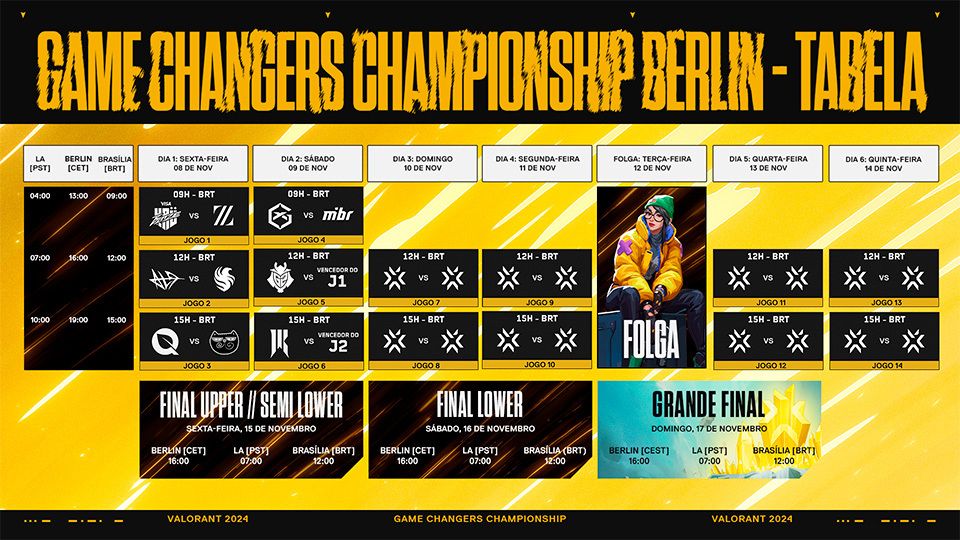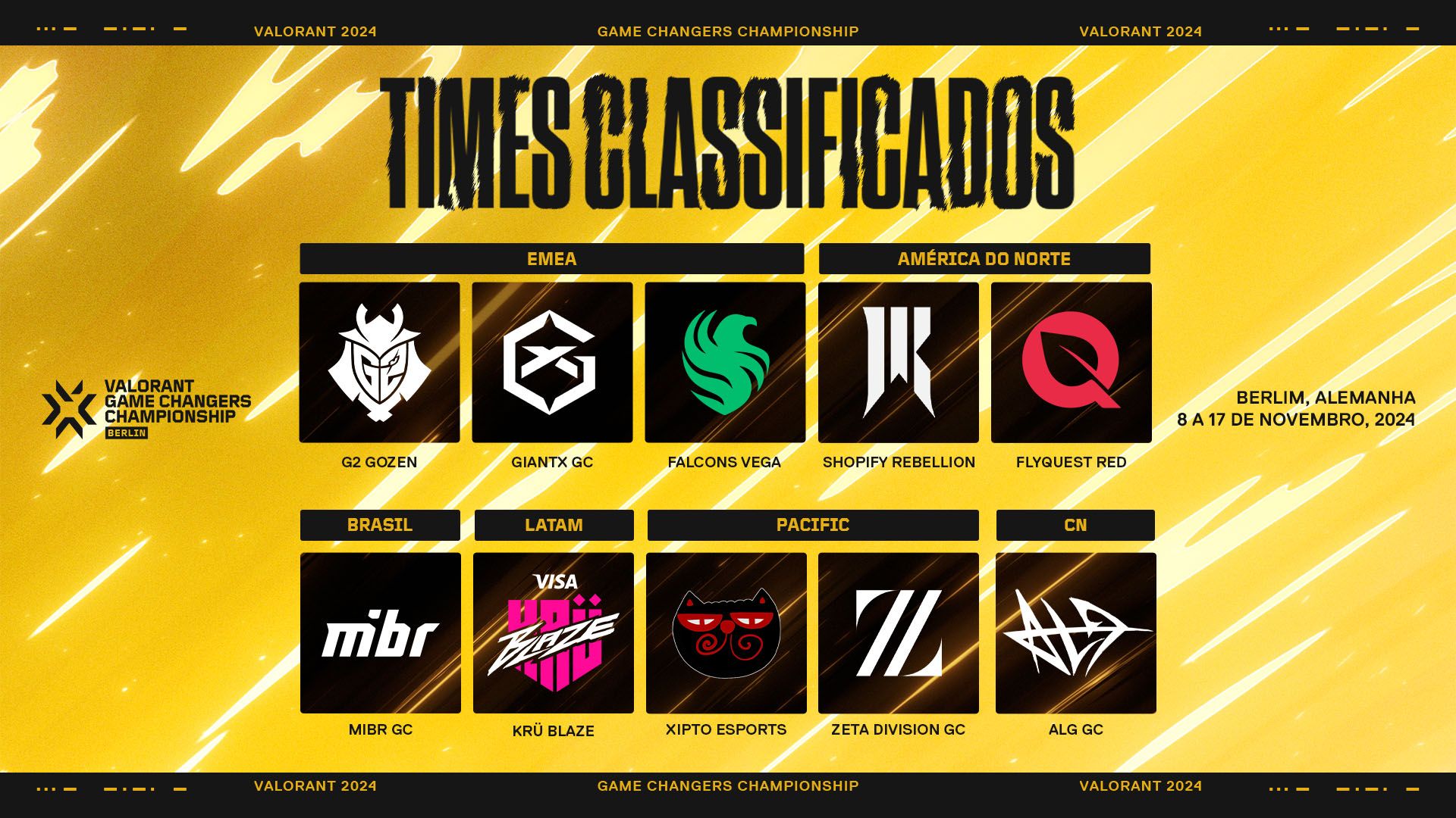 Após um ano de competição e mais de 80 eventos classificatórios ao redor do mundo, o Game Changers Championship está prestes a começar! O momento mais importante do circuito do GC ocorrerá em Berlim, de 8 a 17 de novembro de 2024, e coroará a próxima equipe campeã do VALORANT Game Changers. 10 equipes representando as regiões América do Norte, EMEA, CN, APAC, Brasil e América Latina se classificaram com vitórias em eventos importantes ou acumulando o maior número de pontos de circuito em suas respectivas regiões. As competidoras se enfrentarão em uma chave de eliminação dupla até restar só uma equipe. Acompanhe tudo ao vivo da Riot Games Arena, em Berlin, em twitch.tv/valorant.