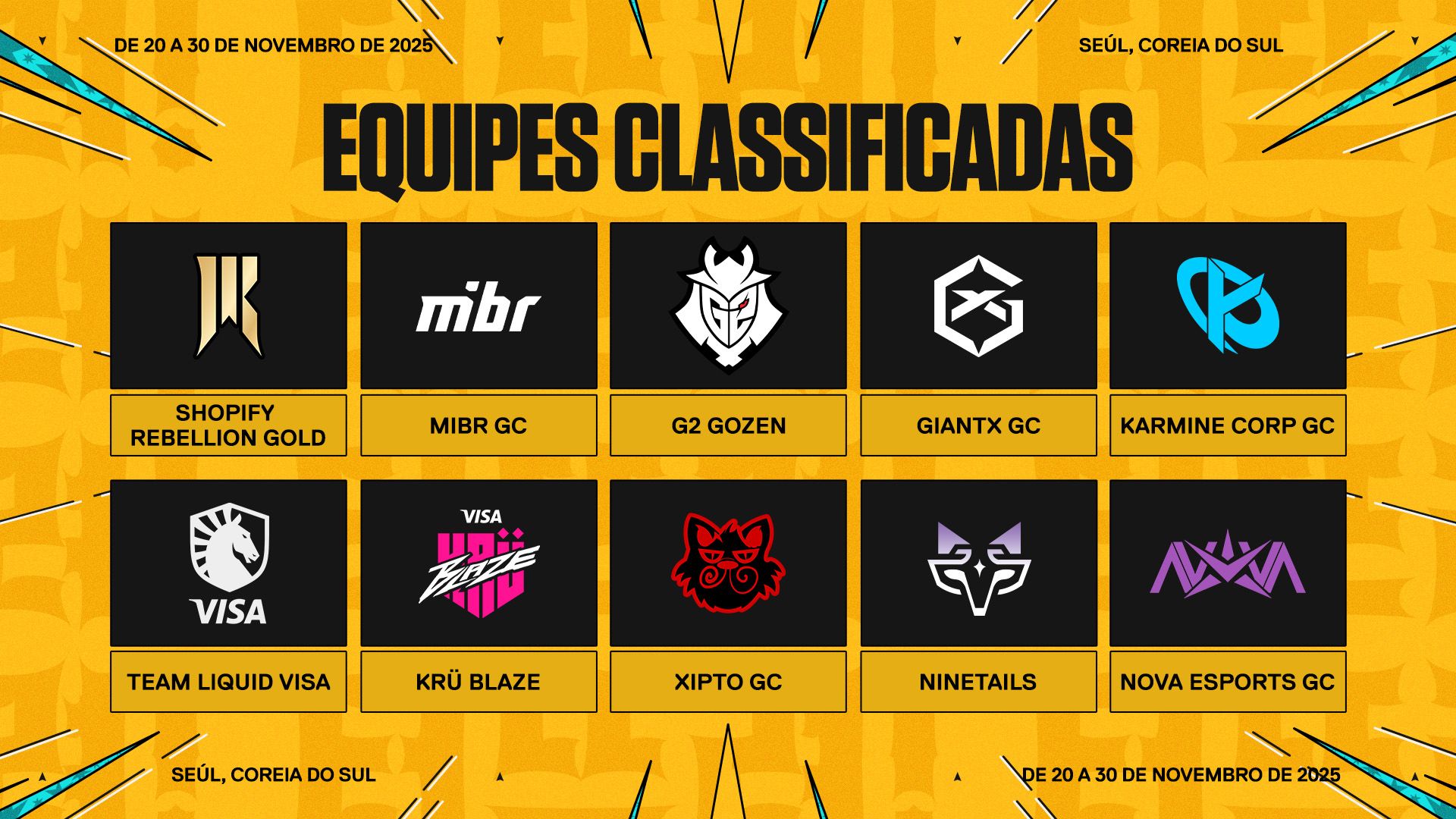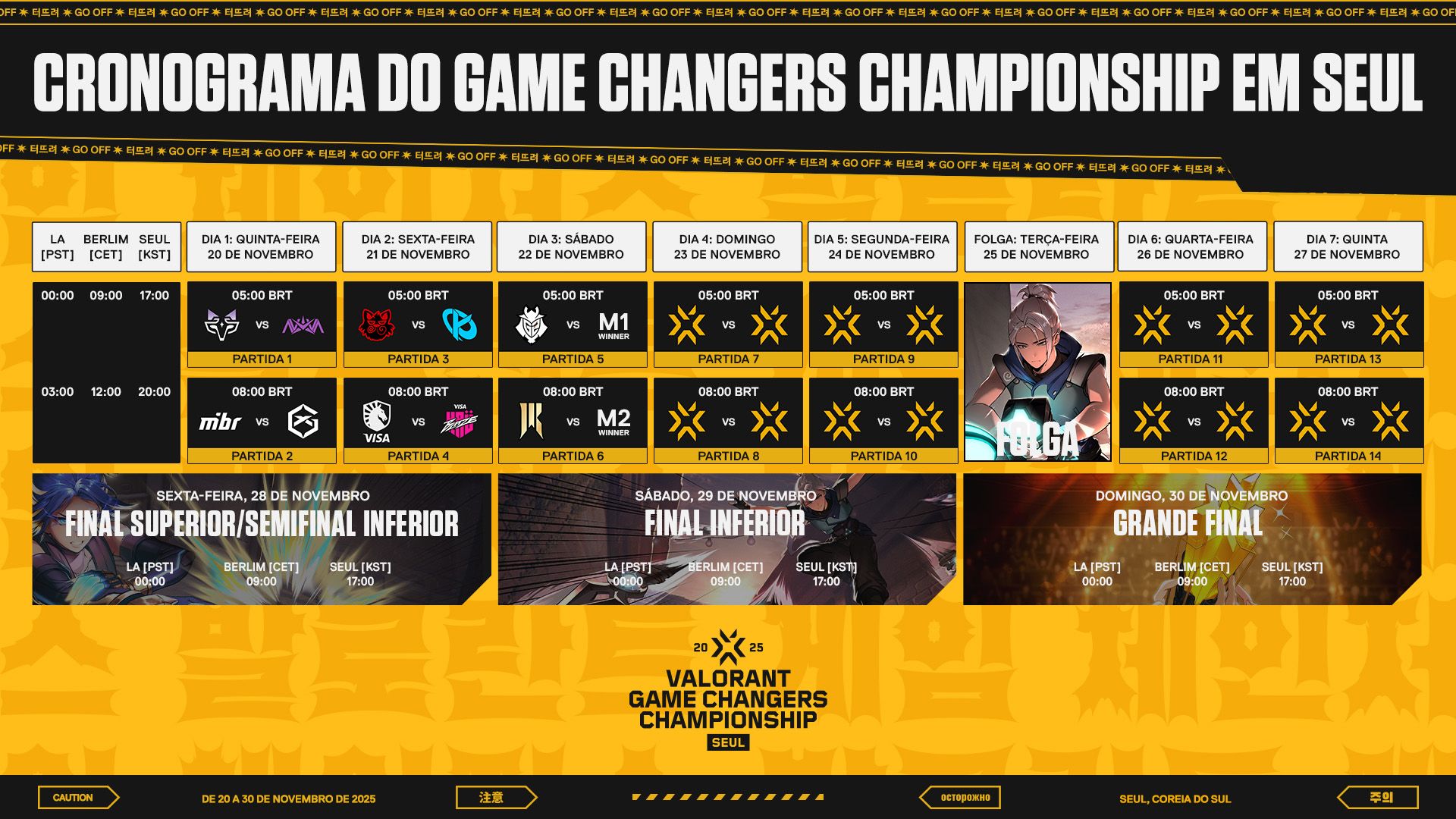 Depois de um ano inteiro de competição e mais de 80 qualificatórias ao redor do mundo, está quase na hora do Game Changers Championship! De 20 a 30 de novembro de 2025, Seul será o palco do ponto mais alto do circuito Game Changers e coroará a próxima Campeã Mundial do VALORANT Game Changers! Dez equipes representando a América do Norte, a EMEA, a CN, a APAC, o Brasil e a América Latina garantiram suas vagas com vitórias em grandes torneios ou acumulando o maior número de Pontos de Circuito em suas regiões. As competidoras disputarão em uma chave de eliminação dupla até restar apenas uma equipe de pé!