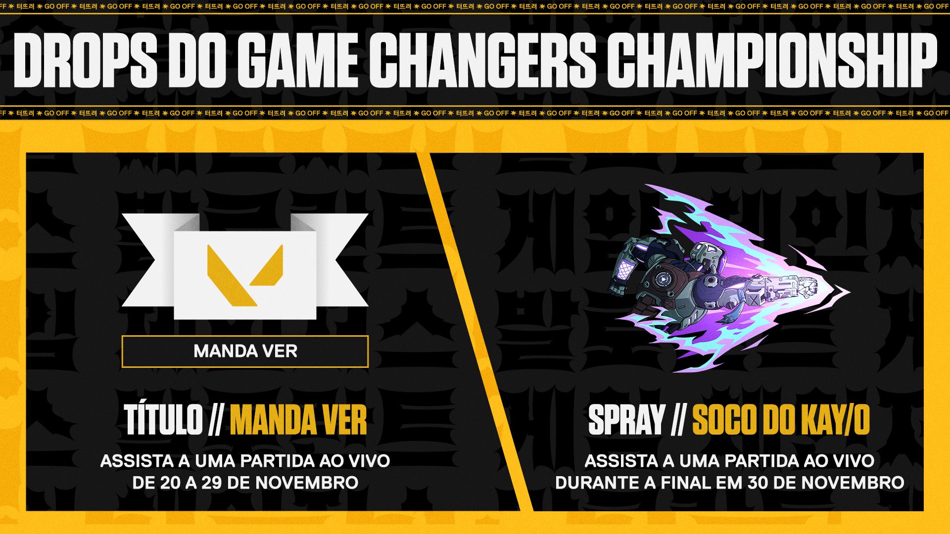 Para comemorar o evento, os fãs poderão garantir um pedacinho da história de VALORANT coletando os drops da transmissão do Game Changers Championship. Para serem elegíveis, os espectadores precisam conectar sua conta do VALORANT à conta do YouTube e/ou da Twitch e assistir às partidas do Game Changers World Championship em canais com drops habilitados durante os horários específicos de transmissão e no dia da Final.