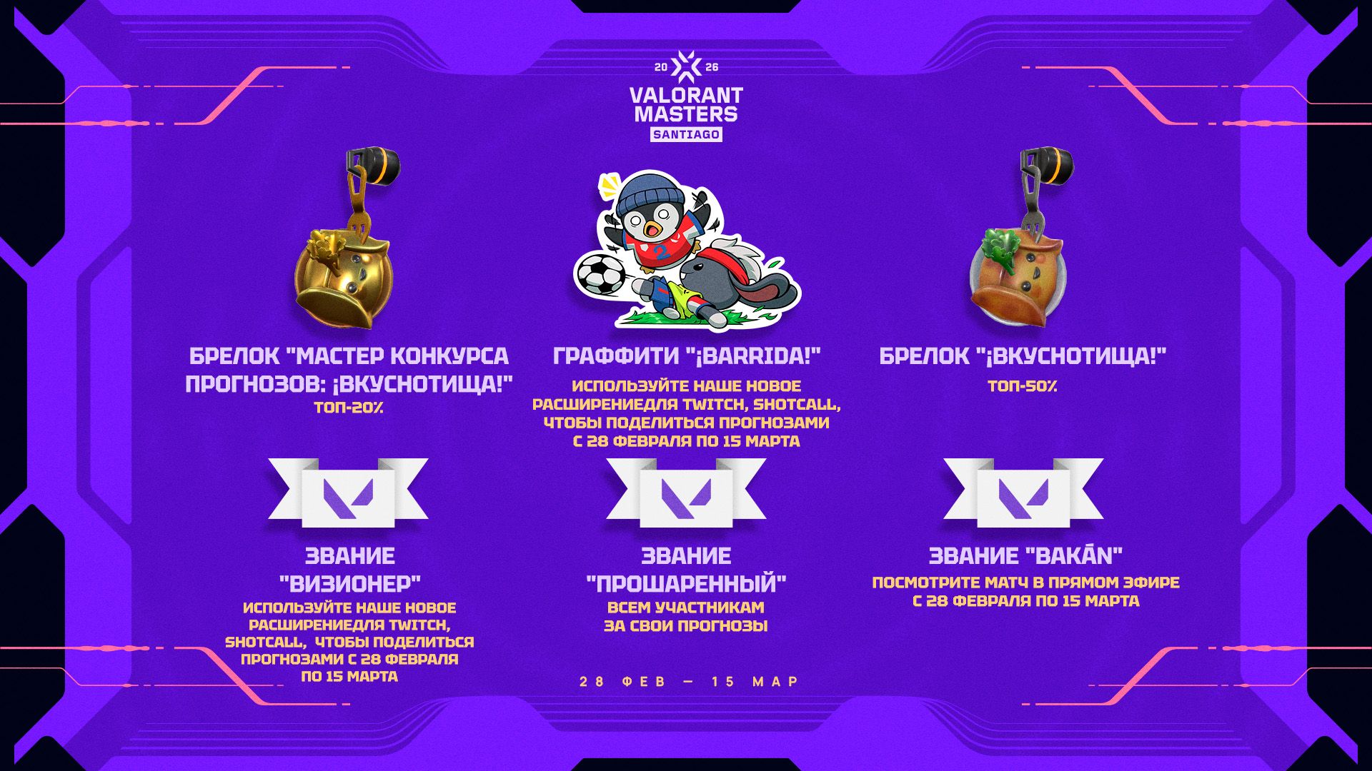 На турнире Masters Santiago также будет доступен Shotcall — расширение Twitch в реальном времени, позволяющее спрогнозировать, что произойдет во время следующих официальных трансляций VCT. Называйте карты, раунды и клатчи в реальном времени, зарабатывайте очки за правильные прогнозы, чтобы подняться выше в глобальном рейтинге игроков. Доступно на настольном компьютере с расширением Twitch.