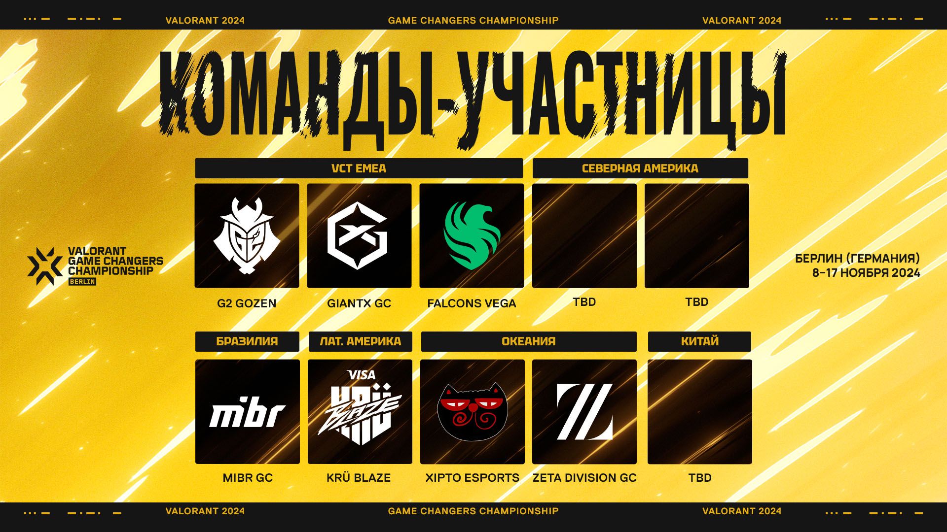 Позади год соревнований и более 80 квалификационных турниров по всему миру — и вот Game Changers Championship уже совсем близко! С 8 по 17 ноября 2024 года в Берлине будет проходить финальное соревнование GC за корону новых чемпионок VALORANT Game Changers! 10 команд будут представлять Северную Америку, EMEA, Китай, АТР, Восточную Азию, Бразилию и Латинскую Америку. Они заслужили путевку, одержав победу в крупных турнирах или набрав наибольшее количество очков в своем регионе. Участницы сразятся в сетке с выбыванием после двух поражений, пока не останется лишь одна команда! Не пропустите прямые трансляции с Riot Games Arena в Берлине на twitch.tv/valorant.
