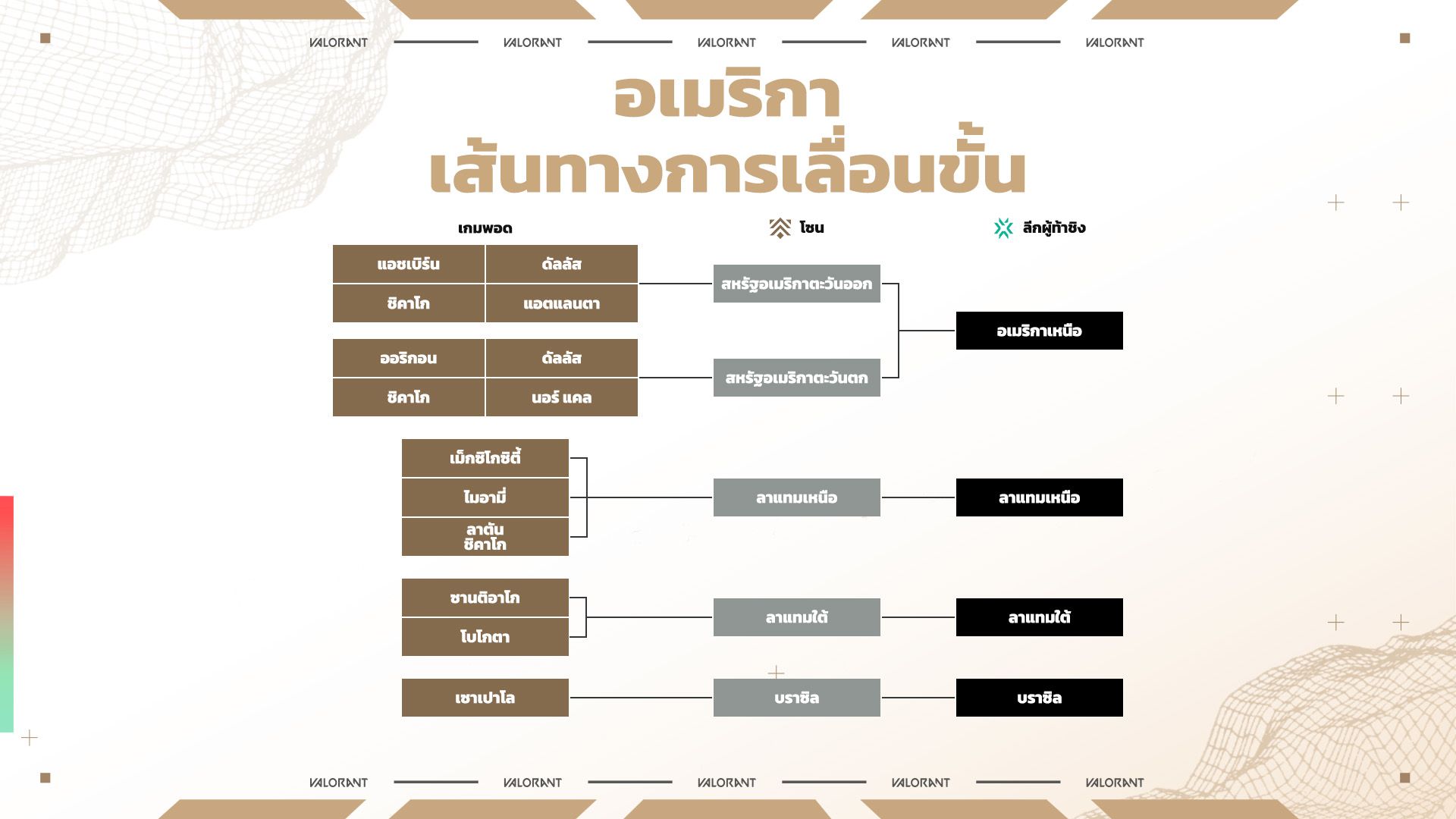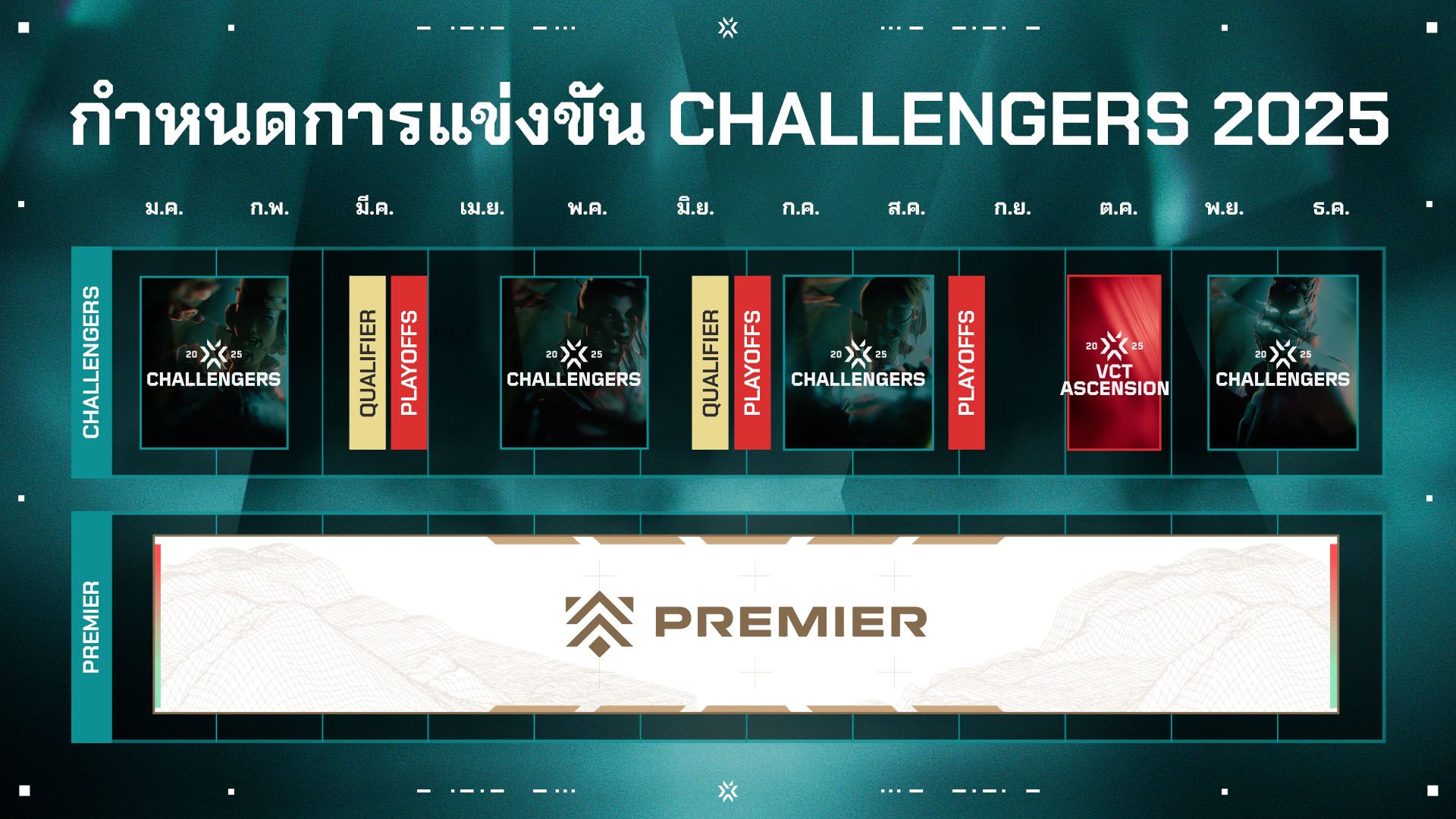 เพื่อให้สามารถจัดการแข่งขัน Challengers ได้ต่อเนื่องตลอดทั้งปี เราจึงเปิดตัวการแข่งขันรายการใหม่ในซีซั่นปกติที่จะจัดขึ้นก่อน Ascension ซึ่งจะเพิ่มจำนวนการแข่งขัน ลดช่วงเวลาที่ไม่มีการแข่งขันในระหว่างปี รวมถึงทำให้ทีมมีโอกาสเลื่อนชั้นมากขึ้น เราได้เห็นทีมต่าง ๆ ประสบความสำเร็จอย่างยิ่งใหญ่เมื่อได้รับโอกาสในการเลื่อนชั้นมากขึ้นในปี 2024 เช่น Sin Prisa และ PCIFIC Esports ซึ่งทะยานขึ้นสู่จุดสูงสุดของ Challengers ภายในระยะเวลาสั้น ๆ หลังเลื่อนชั้นขึ้นมาจาก Premier ดังนั้น เราจึงจะจัดการแข่งขันรอบคัดเลือกสองครั้งในซีซั่นปกติเช่นเคยเพื่อให้ทีมต่าง ๆ มีโอกาสเลื่อนชั้นจาก Premier สู่ VCT ภายในระยะเวลาเพียงหนึ่งปี โปรดติดตามข้อมูลเพิ่มเติมเกี่ยวกับลีก Challenger ประจำภูมิภาคของคุณ เนื่องจากรูปแบบการแข่งขันและระยะเวลาในการเลื่อนชั้นอาจแตกต่างกันไปในแต่ละลีก Challenger