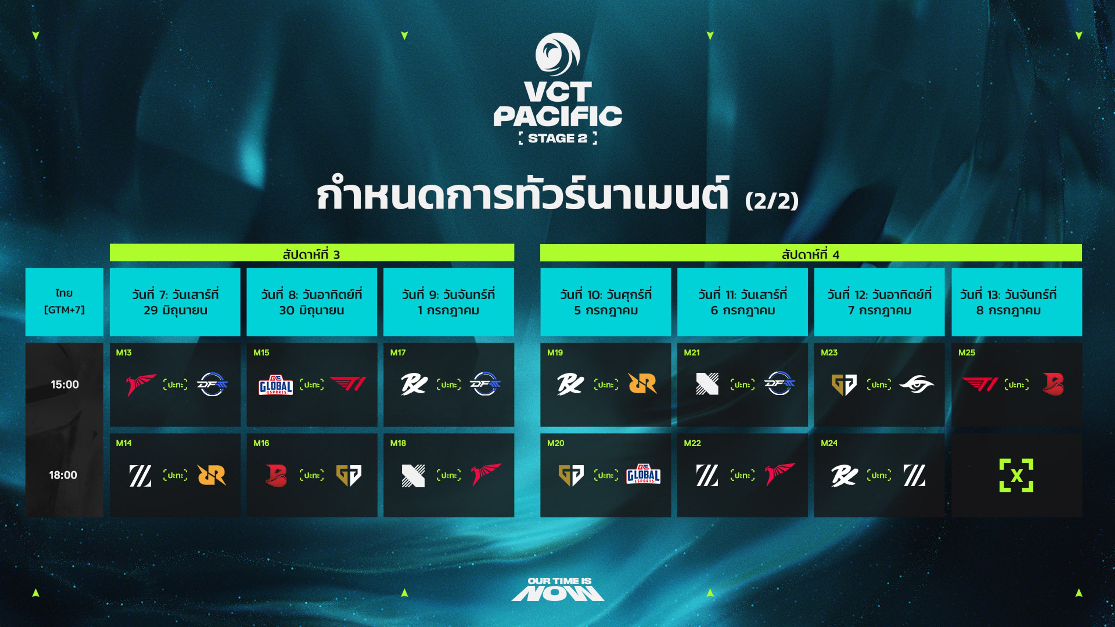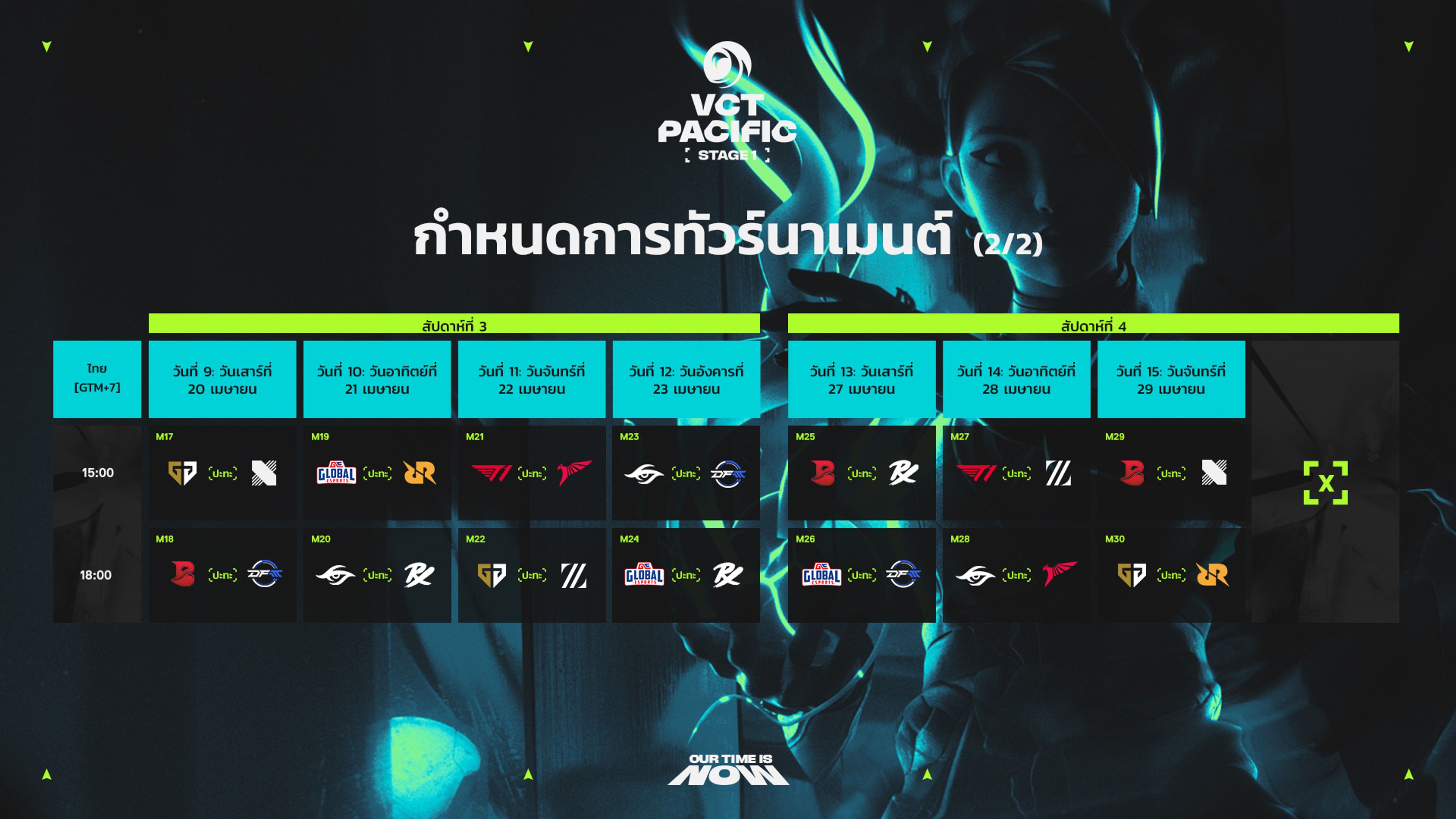 คุณสามารถดูกำหนดการแข่งขันอัปเดตล่าสุดสำหรับ VCT Pacific ได้ที่ VALORANTESPORTS.com ซึ่งจะได้รับการอัปเดตตลอดอีเวนต์