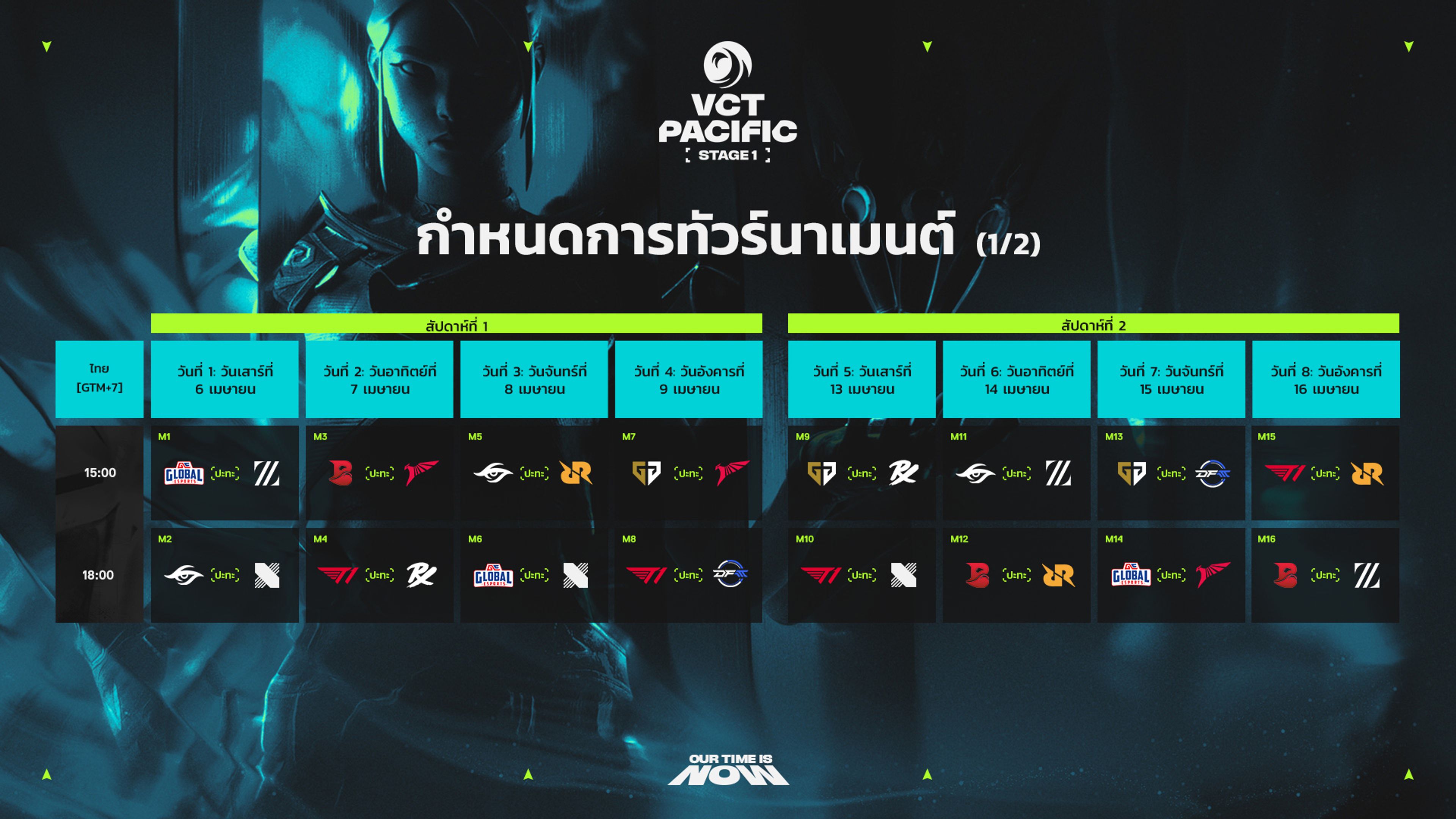 VCT Pacific Stage 1 จะเริ่มในวันที่ 6 เมษายน และจะดำเนินไปจนถึงวันที่ 12 พฤษภาคม โดยทัวร์นาเมนต์นี้จะประกอบด้วยการแข่งขันทั้งหมดสอง Stage: