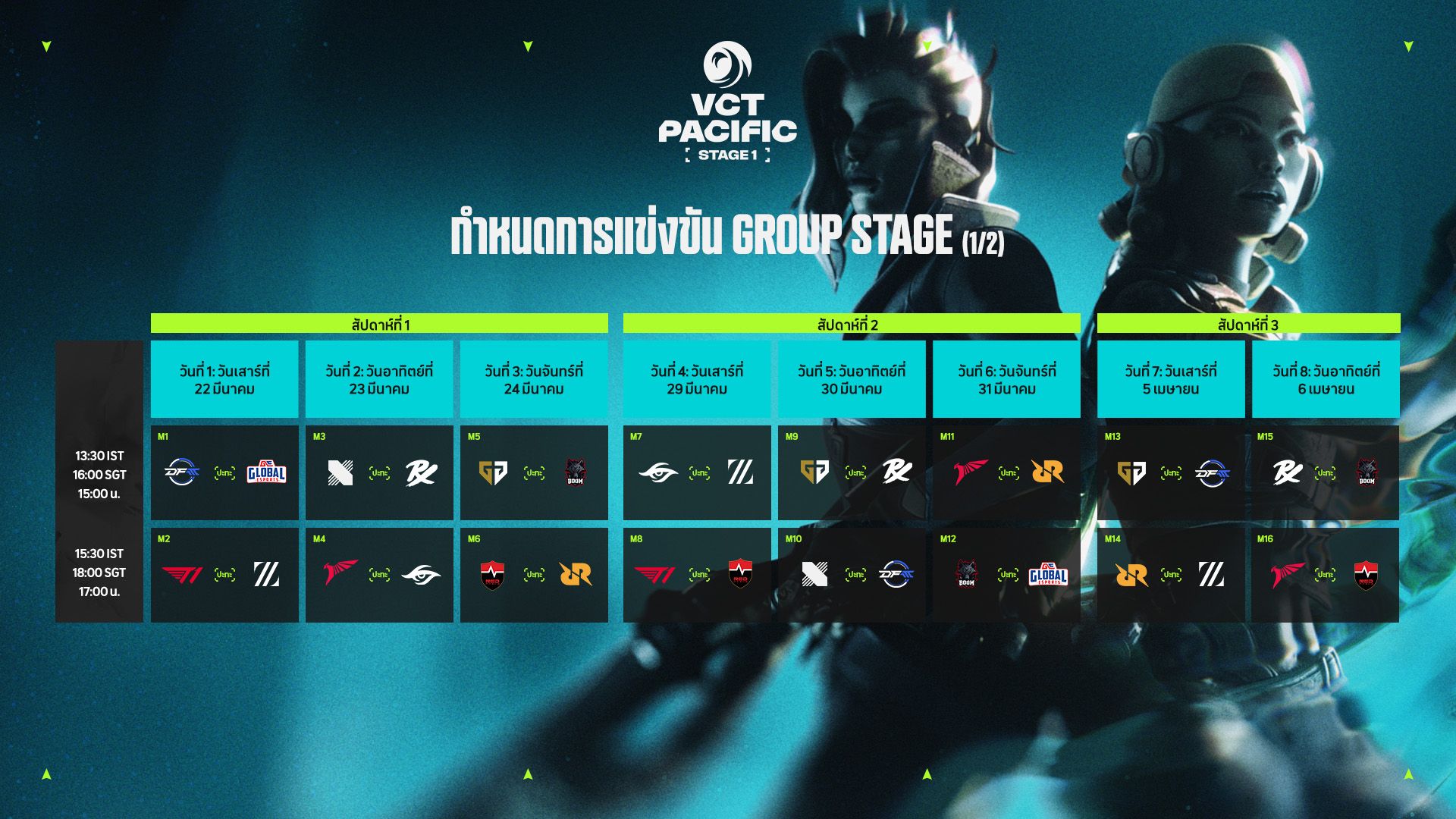 VCT Pacific Stage 1 จะเริ่มในวันที่ 22 มีนาคม และดำเนินไปจนถึงวันที่ 11 พฤษภาคม