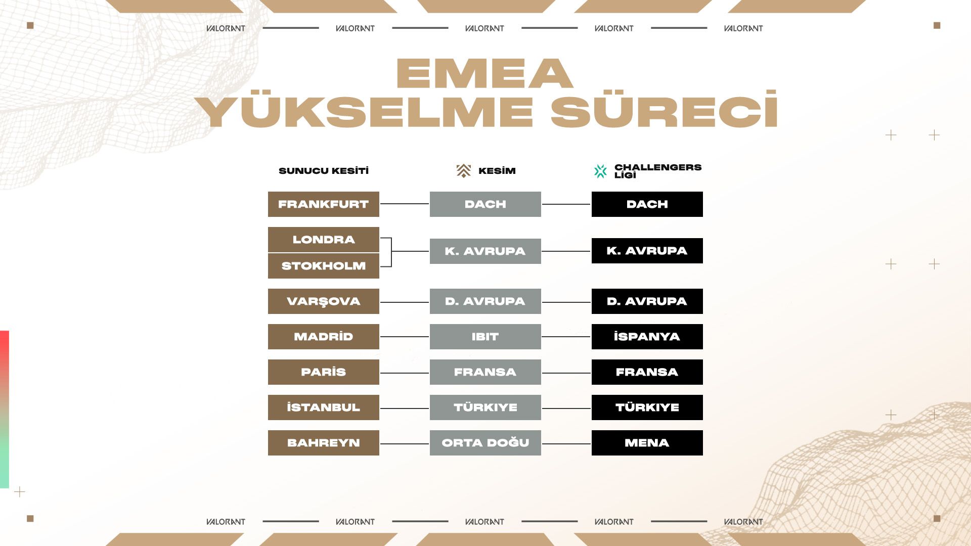 Küresel çapta Premier'den Challengers'a, oradan da uluslararası liglere ve potansiyel olarak Champions sahnesine uzanan net bir yol var. Yolculuğunuza başlamak için Premier sunucu kesitinizi ve ilgili Challengers liglerini kontrol etmeyi unutmayın. Bölgenizdeki Challengers liglerinin ikamet şartlarını inceleyerek sizin ve takımınızın söz konusu Challengers liglerine yükselmeye uygun olup olmadığını doğrulamanız gerek.