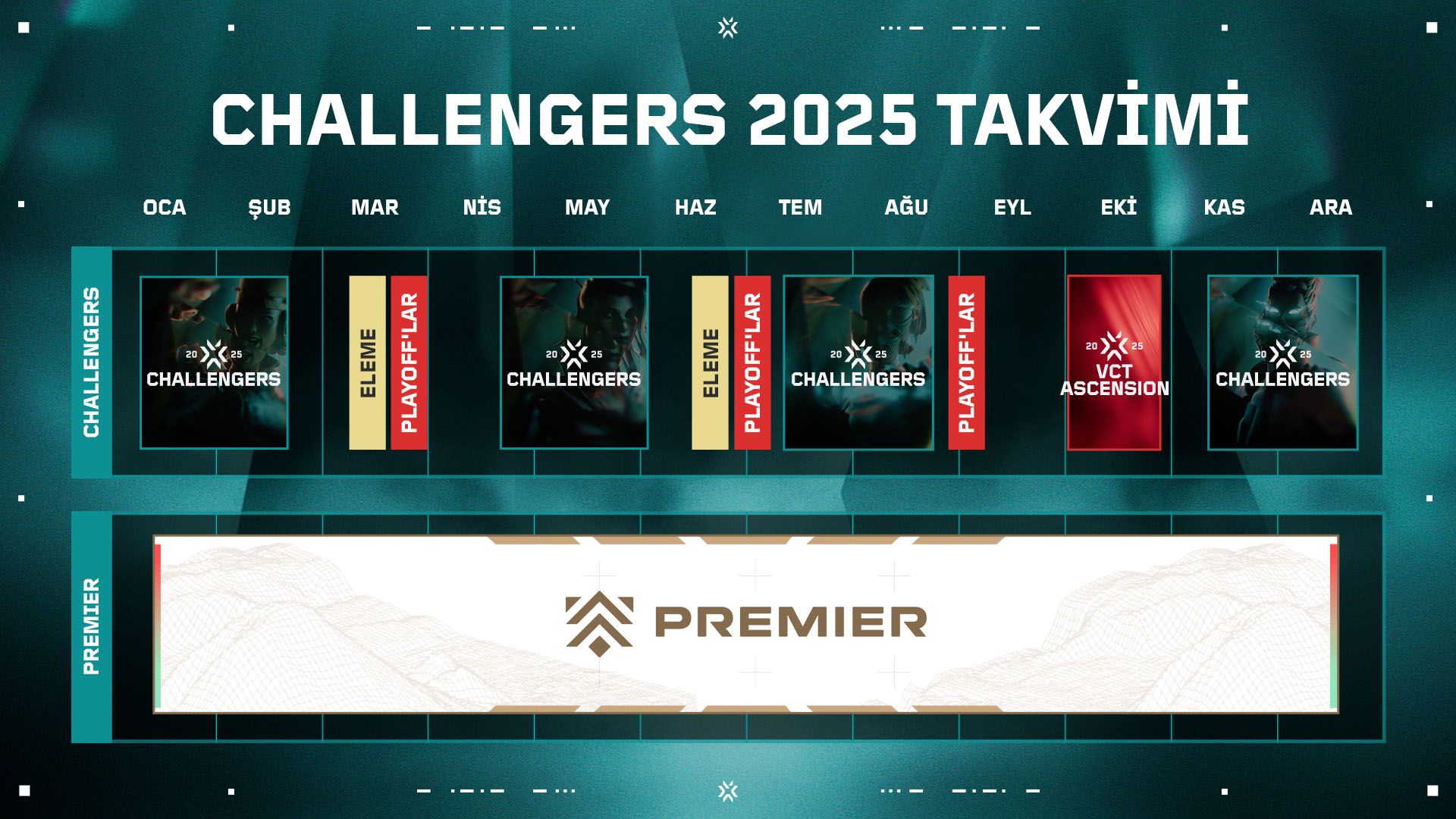 Yılın sonuna yaklaşırken Challengers 2025 Sezonu'yla ilgili ilk detayları paylaşmak istiyoruz. Gelecek sezonda Challengers'la VCT ekosisteminin tüm parçaları arasındaki bağı daha da güçlendirmeyi hedefliyoruz. Challengers ligleri rekabetçi sahnede yeni oyuncuların yeteneklerini geliştirebileceği ve becerilerini tanıtma fırsatı bulabildiği önemli bir basamak. 2024 yılında olduğu gibi Challengers tüm yıl boyunca sürecek. Rekabet ocak ayında başlayacak, ekim ayında Ascension'la zirveye ulaşacak, aralık ayında ise Challengers ve Premier turnuvalarıyla sona erecek.