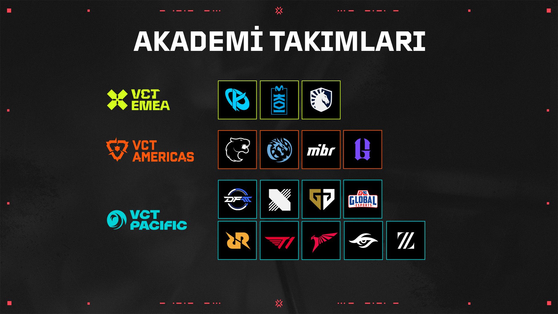 2025 yılında partner takımların Challengers'da akademi takımları kurarak kadroları için yeni yetenekler geliştirmelerine ve oyuncular için daha fazla fırsat sunmalarına olanak tanıyacağımızı duyurmuştuk. Akademi takımları Ascension'a katılmaya hak kazanamayacak olsa da Challengers ekosistemine desteğimizi arttıracağımız için çok heyecanlıyız. Aşağıda yer alan dünya genelindeki akademi takımlarının yeni yetenekleri için gözünüzü dört açın!