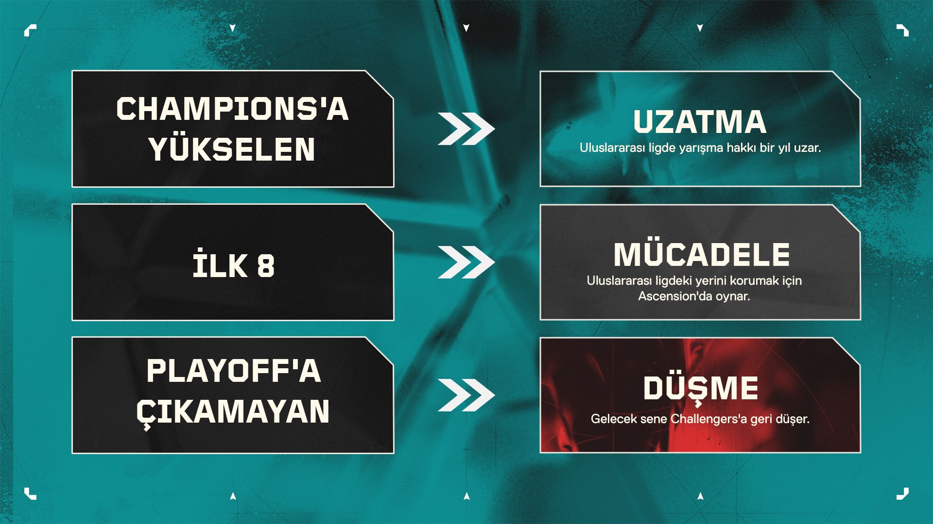 Premier kesimleri Challengers liglerine bağlanarak oyuncuların oyun içi rekabetten VCT'ye pürüzsüz bir geçiş yapabilmelerini sağlıyor. Küresel çapta Challengers'dan uluslararası liglere ve potansiyel olarak Champions sahnesine uzanan yol böylece netleşmiş oldu.