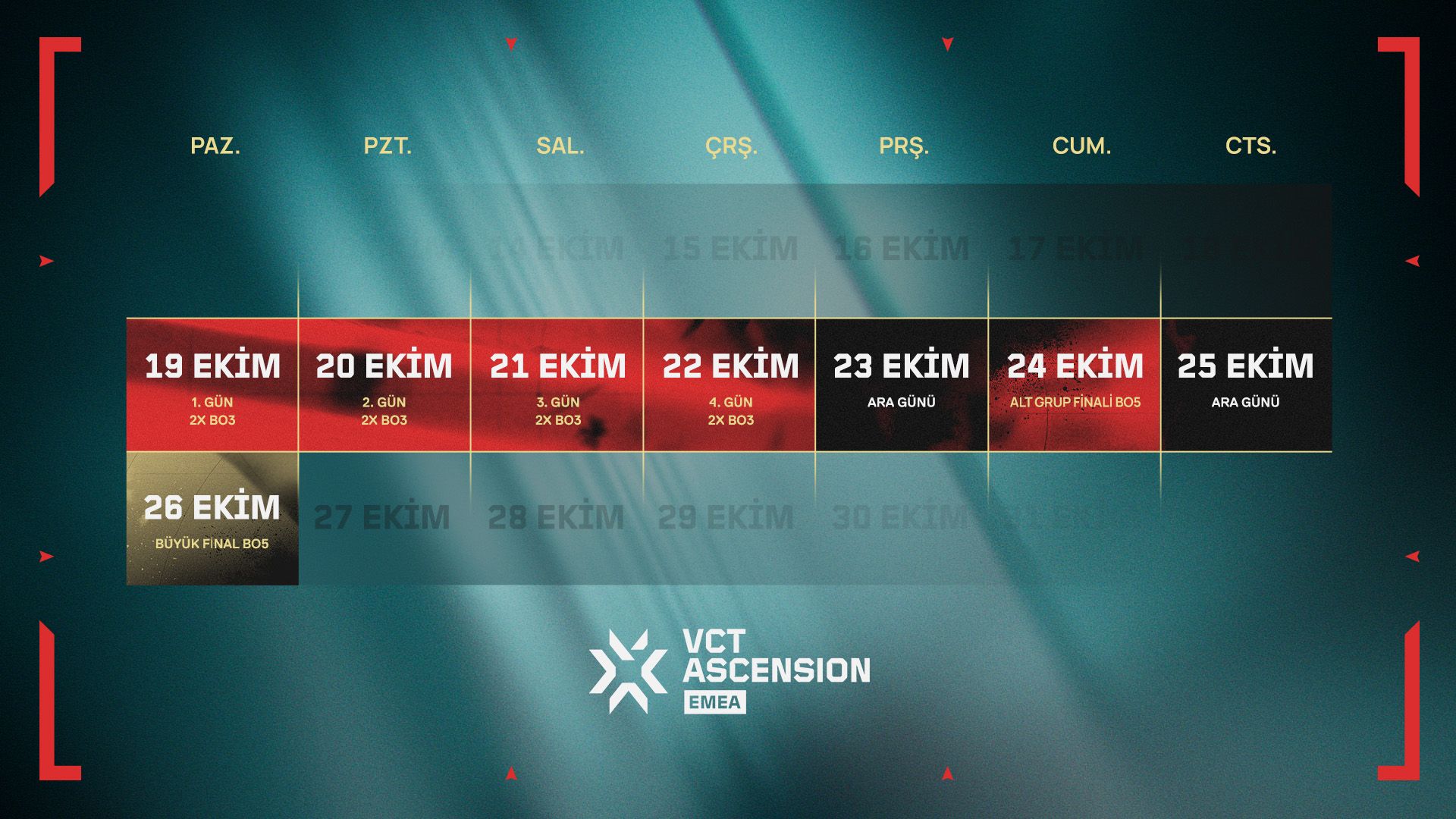 EMEA'nın yükselen yıldızları sahneye çıkmaya hazırlanıyor. Ekimde bölgenin en iki 2. Kademe takımları VCT Ascension EMEA'da mücadele edecek. Kazanan takım, VCT EMEA'da yer alma fırsatına sahip olacak.