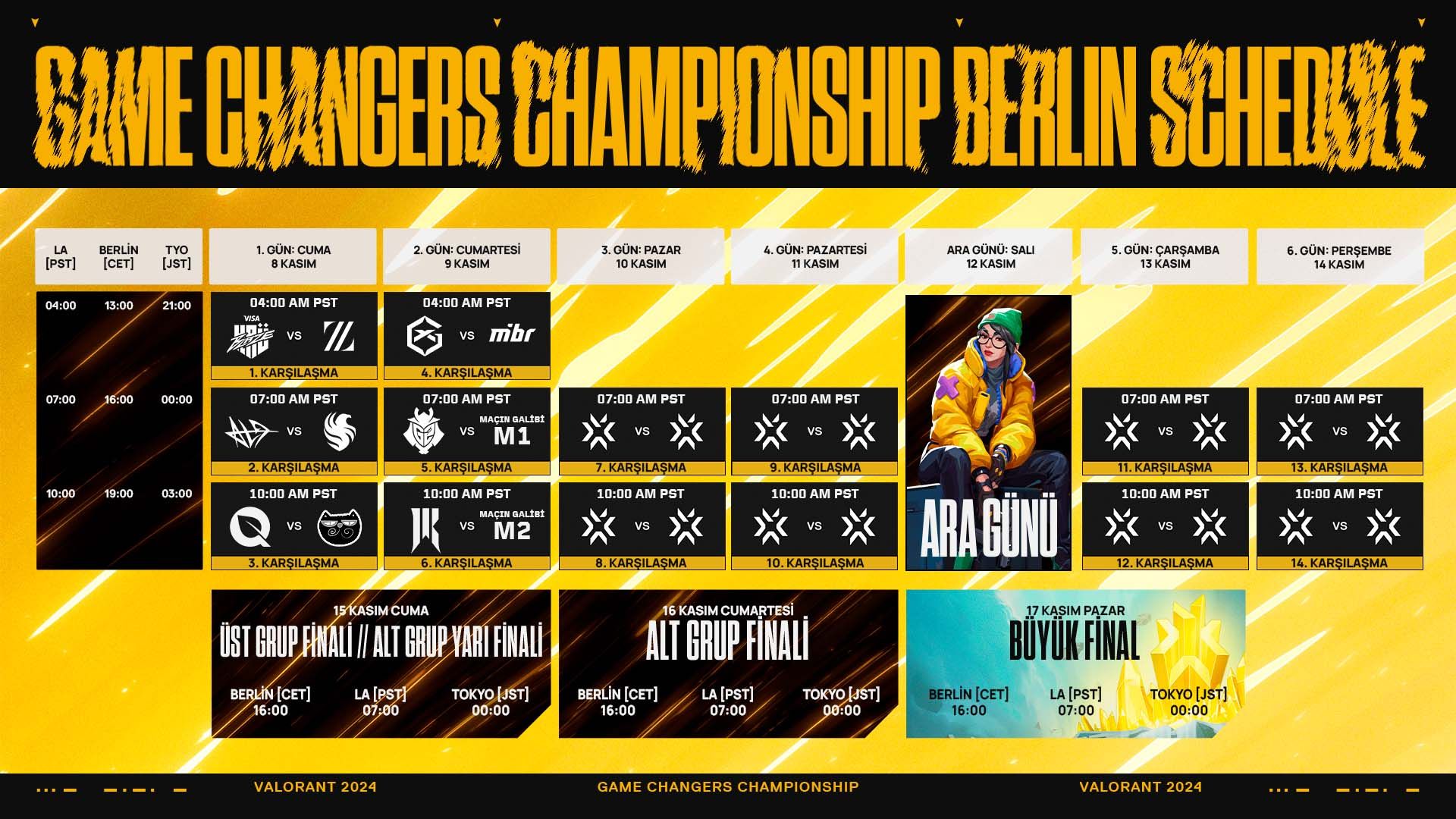 Mücadelelerle dolu bir yılın ve dünyanın dört bir yanında gerçekleşen 80 eleme etkinliğinin ardından Game Changers Championship nihayet başlamak üzere! Berlin 8-17 Kasım 2024 tarihleri arasında Game Changers rekabetinin zirvesine ev sahipliği yapacak ve yeni VALORANT Game Changers Şampiyonu belli olacak! Turnuvada, büyük etkinliklerde zafer kazanarak veya kendi bölgelerinde en çok tur puanını toplayarak katılım hakkı elde eden 10 Kuzey Amerika, EMEA, CN, APAC, Brezilya ve Latin Amerika temsilcisi yer alacak. Takımlar geriye sadece bir takım ayakta kalana dek çifte eleme grubunda savaşacak! Twitch.tv/VALORANT_TUR adresi üzerinden Berlin Riot Games Arena'daki heyecana ortak olabilirsiniz.