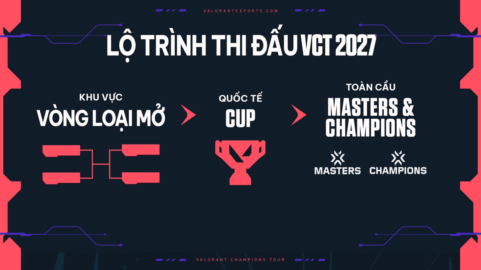 Bắt đầu từ năm 2027, tất cả các đội sẽ thi đấu trong một hệ thống thống nhất và một cấp độ cạnh tranh duy nhất. Cấu trúc mới này loại bỏ các rào cản cho những tài năng đang lên và tạo ra con đường trực tiếp hơn để có thêm nhiều đội vươn lên đỉnh cao của môn thể thao này. Với thể thức gồm toàn các giải đấu và lịch trình sự kiện được mở rộng, VCT sẽ đến với nhiều thành phố hơn, mang đến cho nhiều tuyển thủ và người hâm mộ cơ hội trải nghiệm tất cả những gì môn thể thao này mang lại.