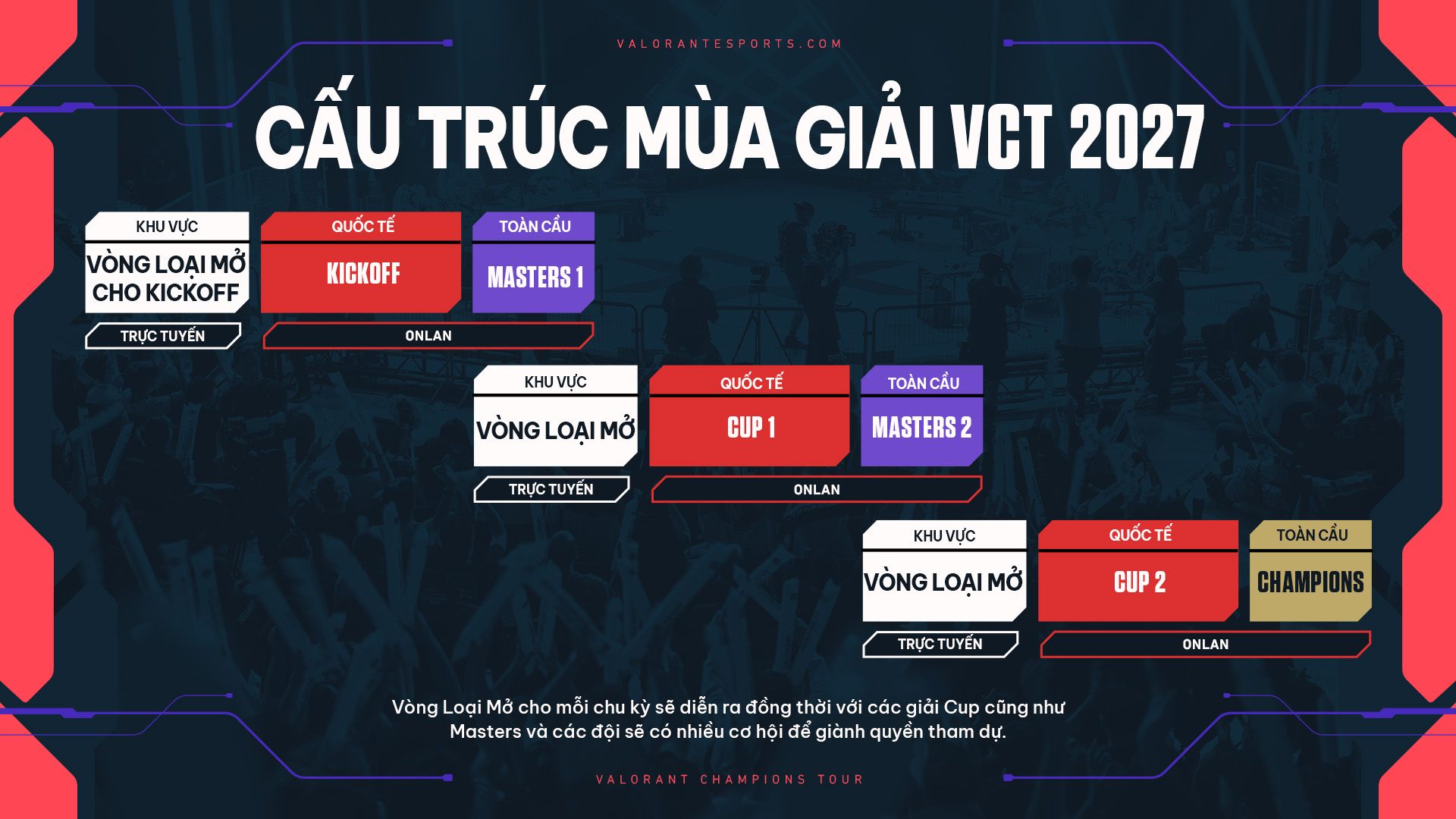 Hôm nay, chúng tôi sẽ chia sẻ thông tin đầu tiên trong loạt thông tin cập nhật về những thay đổi đối với Esports VALORANT mà bạn sẽ thấy vào năm tới. Trong năm 2027, VCT sẽ chuyển sang mô hình giải đấu mang đến nhiều khoảnh khắc kịch tính hơn trong suốt mùa giải, các sự kiện mới đến gần người hâm mộ hơn, cũng như những cách thức mới để bất kỳ đội tuyển nào cũng có thể giành quyền tham dự các sự kiện toàn cầu của VCT: Masters và Champions. Cấu trúc mới này sẽ tập trung vào các nguyên tắc sau: