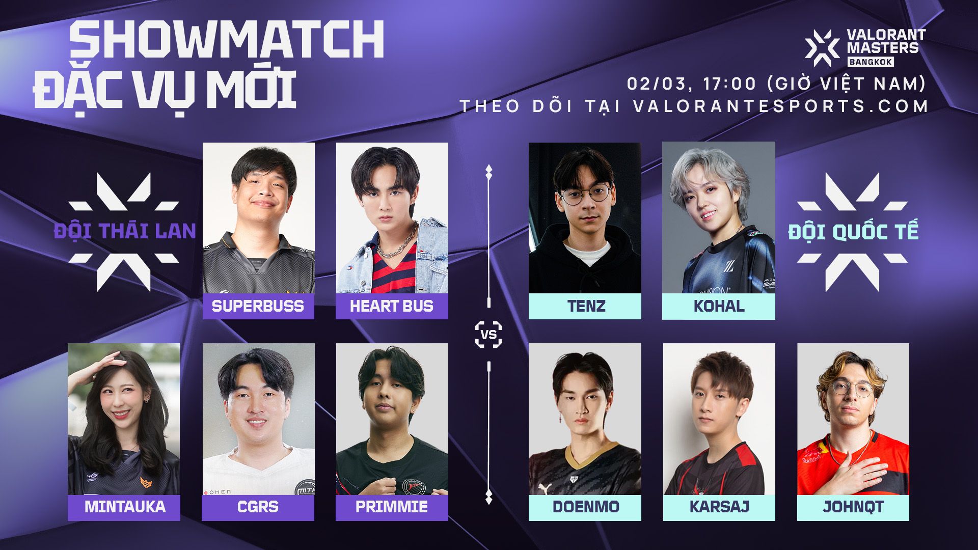 Hãy sẵn sàng cho một ngày thi đấu VALORANT bùng nổ tại Chung Kết Tổng Masters Bangkok vào Chủ Nhật, ngày 02/03. Chúng ta sẽ bắt đầu chương trình với màn hé lộ rực rỡ về một Đặc Vụ hoàn toàn mới, tiếp nối bằng một trận showmatch đặc biệt, nơi các nhà sáng tạo nội dung mà bạn yêu thích sẽ sử dụng Đặc Vụ Đối Đầu mới nhất để so tài với nhau!