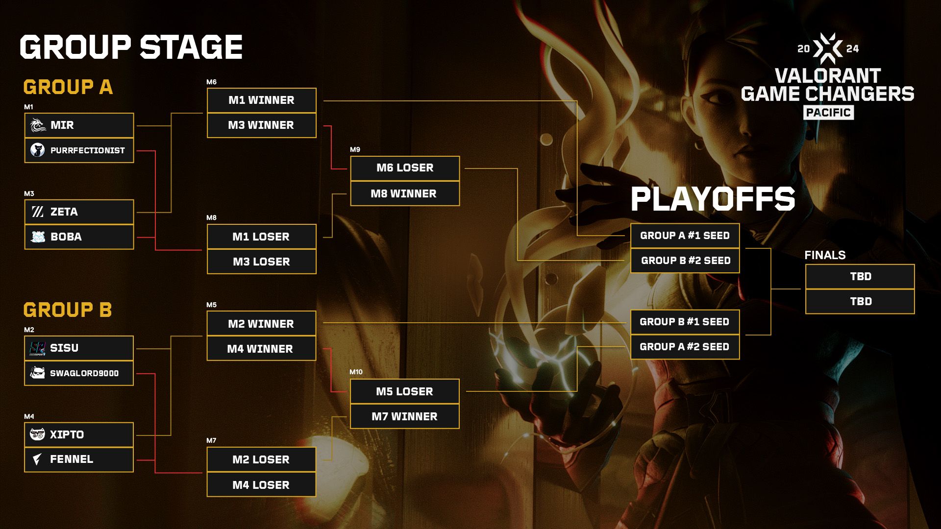我們會根據戰隊先前的競技表現和各自VCT顛覆者聯賽的整體規模,將戰隊分為2個小組。來自同賽區的戰隊不會在賽事的第一場比賽中交手。