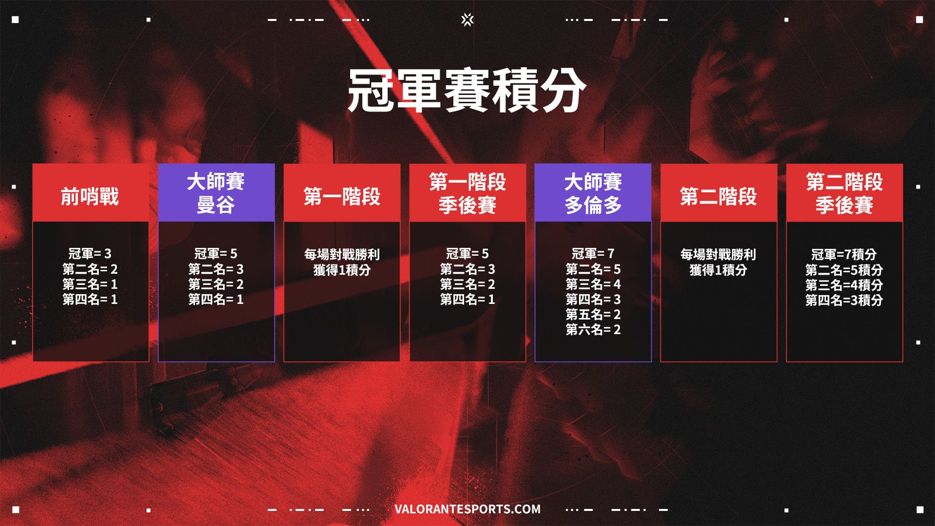 與去年相似,各個階段與賽事都會發放冠軍賽積分。我們的目標是確保賽季各個階段的勝負都至關重要,對後續發展能造成影響。為了解決這個問題,我們做出兩項重大改革:在較後期的大師賽與季後賽廣發積分,而階段賽則自成一格,讓所有隊伍在來到賽季中期時能有個煥然一新的開始。