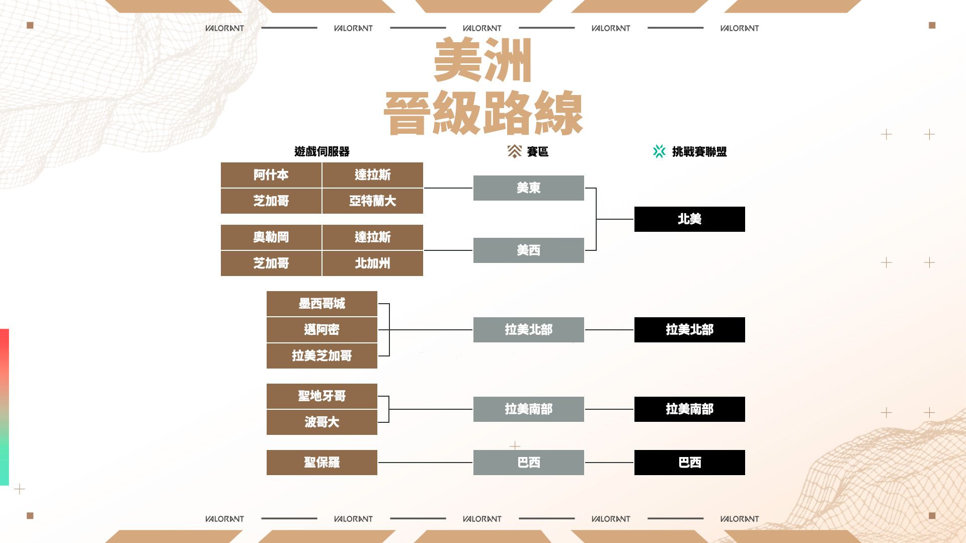 在美洲賽區,北美與巴西挑戰賽聯賽的冠軍隊伍將各自直接獲得「Champions晉級之路」的晉級名額。至於LATAM賽區,我們將把LATAM北部與LATAM南部的冠軍隊伍集合起來,競爭LATAM名額。最後一個名額將透過最終資格賽決定,參賽隊伍包括:北美第二名、巴西第二名,以及LATAM決賽的落敗隊伍。